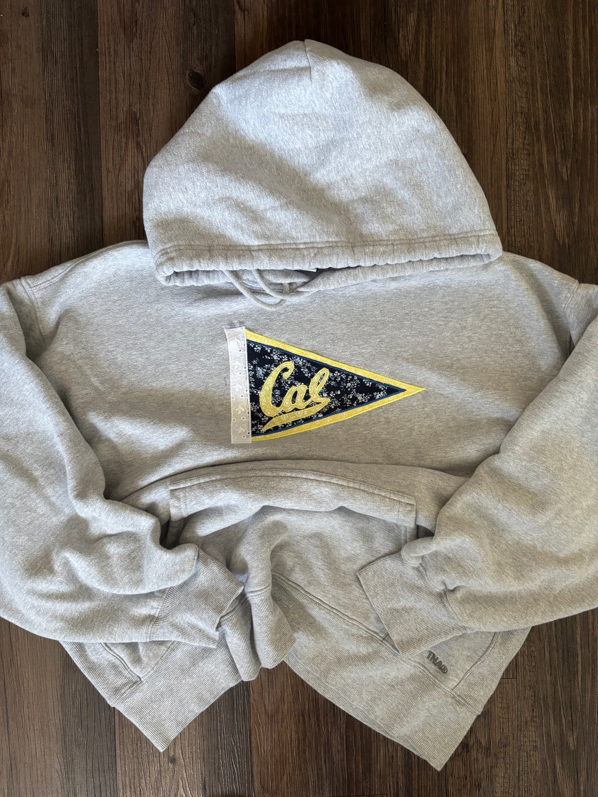 This sweatshirt uses a thrifted hoodie as its base with a triple layered hand-embroidered appliqué pennant + patch.