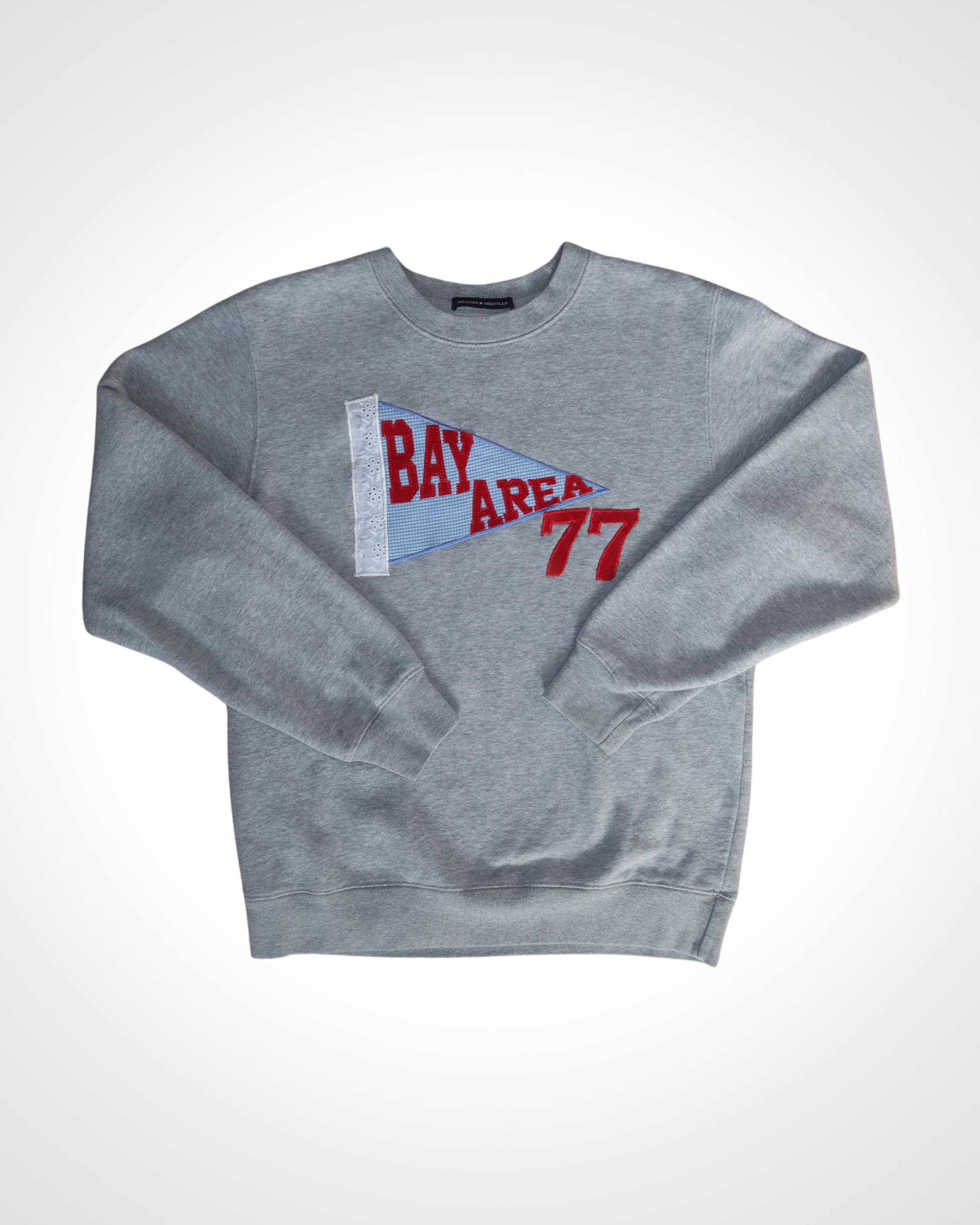 This sweatshirt uses a thrifted hoodie as its base with a triple layered hand-embroidered appliqué pennant + patch.