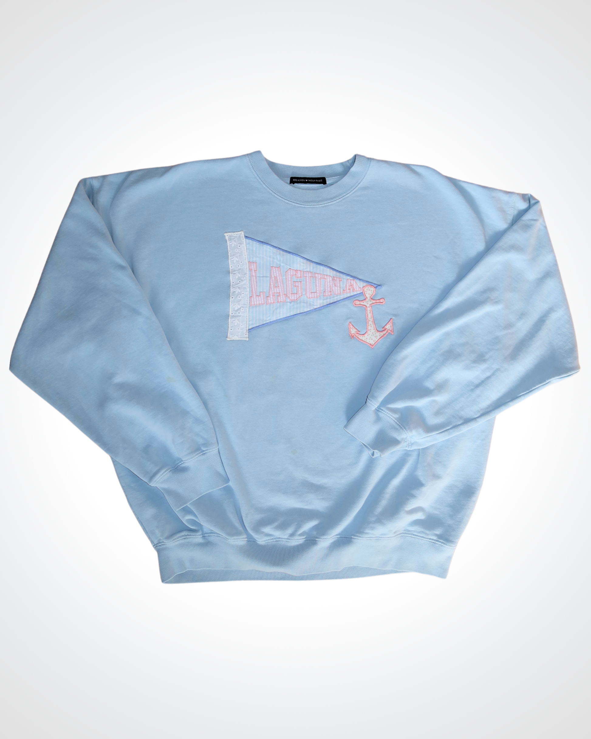 This sweatshirt uses a thrifted hoodie as its base with a triple layered hand-embroidered appliqué pennant + patch.