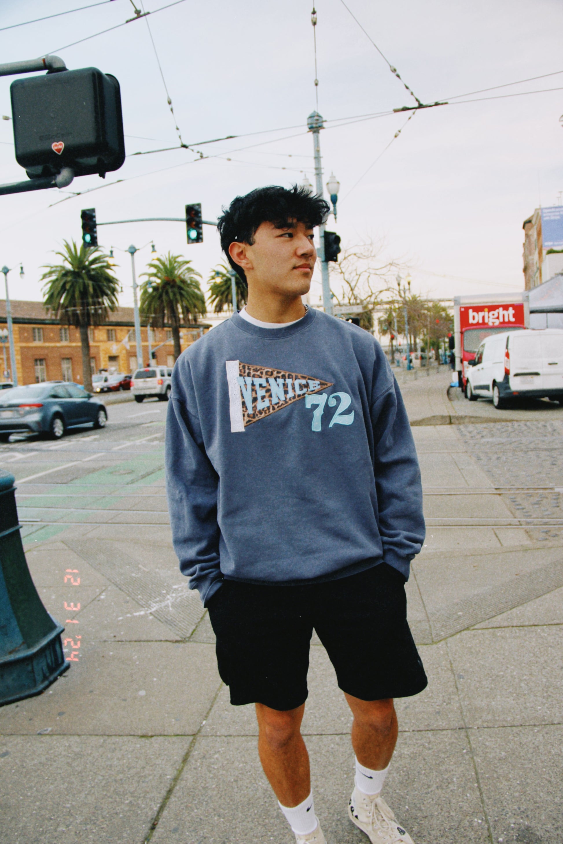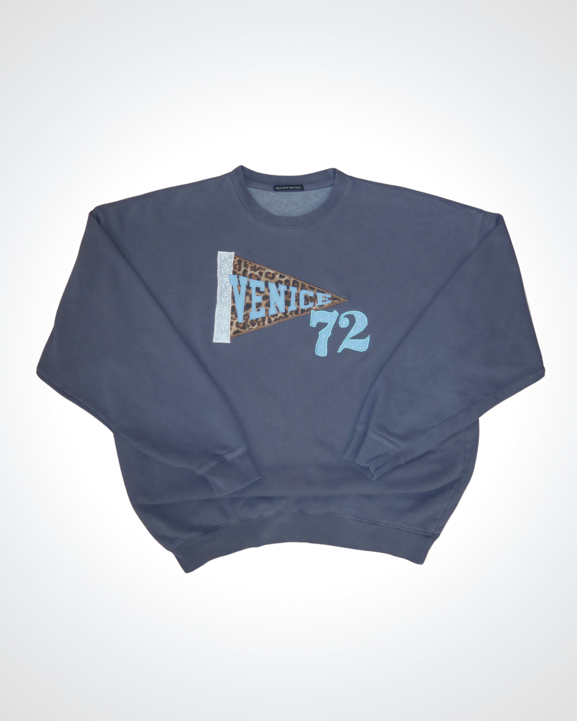 This sweatshirt uses a thrifted hoodie as its base with a triple layered hand-embroidered appliqué pennant + patch.