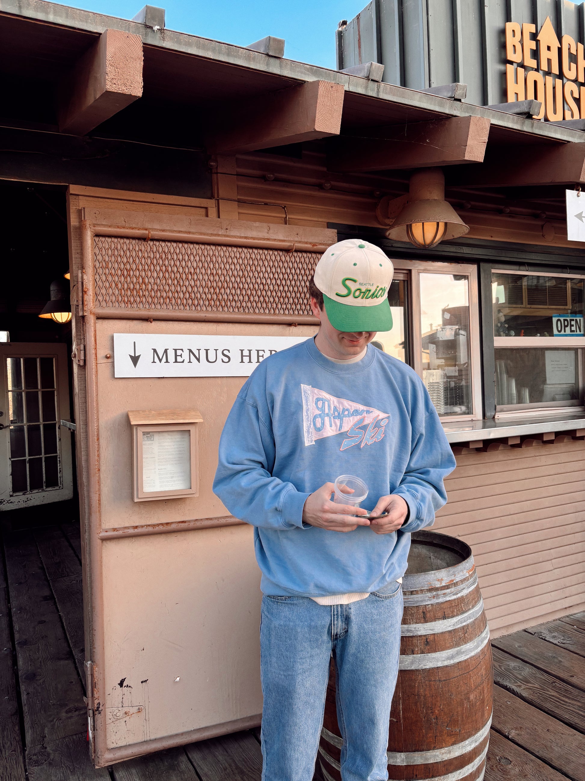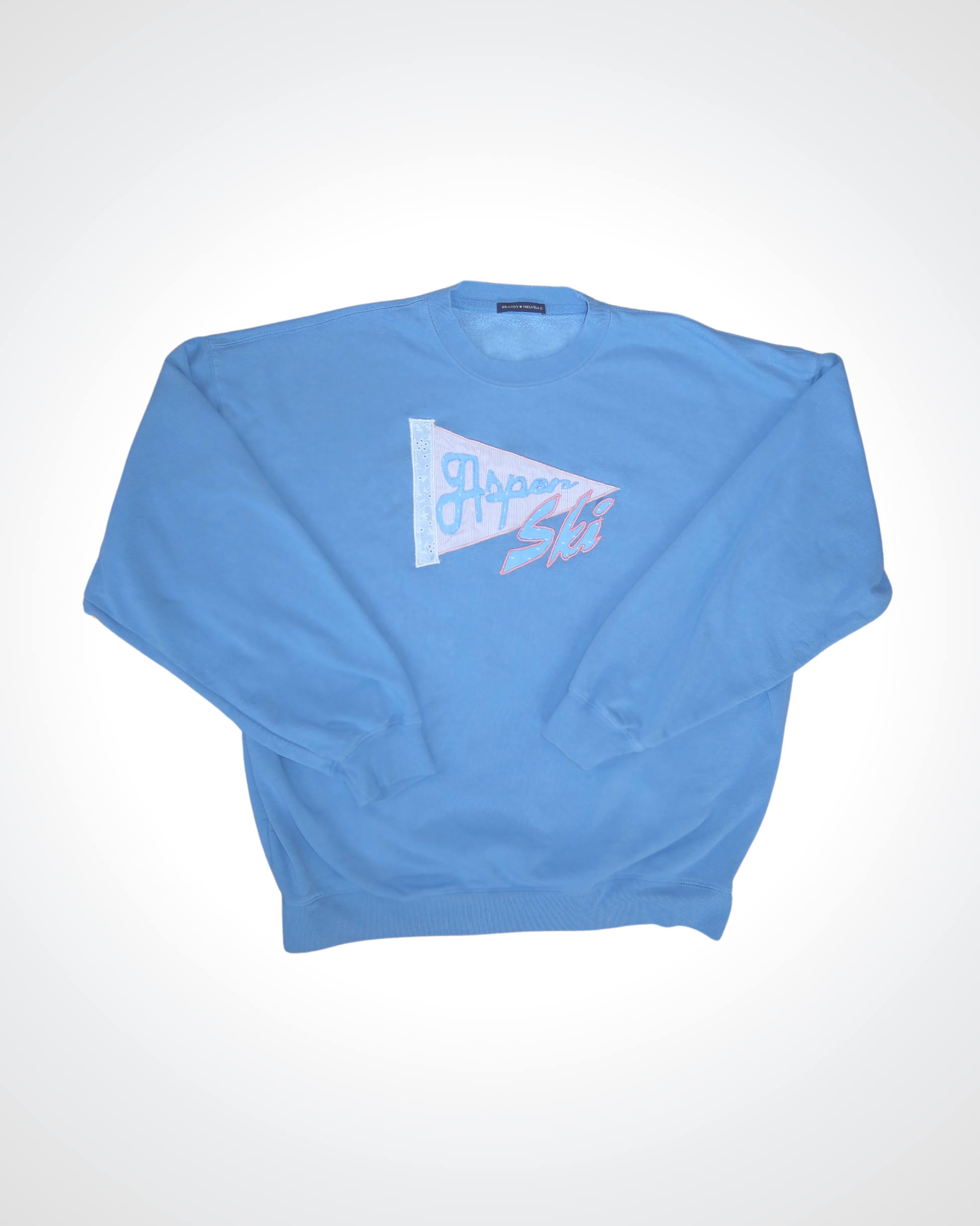 This sweatshirt uses a thrifted hoodie as its base with a triple layered hand-embroidered appliqué pennant + patch.